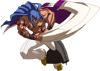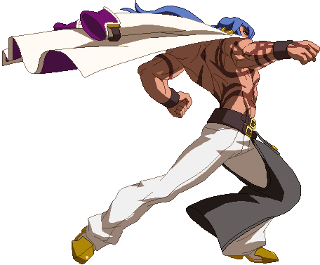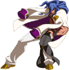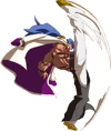 A big uppercut with a turning recovery animation. Launches the enemy, but can’t be jump-canceled. Can be dash canceled during the part where he spins around after the uppercut, regardless of whiff, hit or block. Possibly useful against expected cross-ups or as a delayed anti-air. It is very unsafe though, so dash-canceling to avoid getting punished is almost a necessity. In Ver. 2.0, it’s possible to now cancel the later frames of the move with a jump or special cancel.