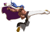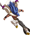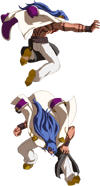 An inward leading leg spinning roundhouse kick swipe. Causes knockdown and wide horizontal range to make for a strong cross-up tool. Overhead, but applies a low weakpoint. Ground bounces with weakpoint on air hit, staggers with weakpoint on ground hit. An alternate option to his j.D scenarios if one wants to apply a low weakpoint instead.