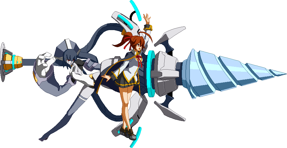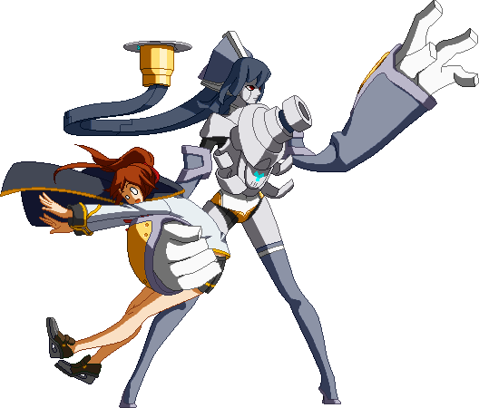 The finishing 5D. Minerva connects her plug to a socket that appears behind her and performs a double uppercut with Celica, similar to Hache Rotir.
