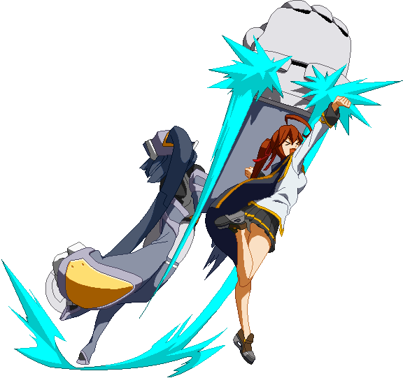 The finishing 2D. Minerva connects her plug to a socket that appears behind her, transforms her hands into a hammer and swings vertically, similar to Marteau Flan. Hits high.