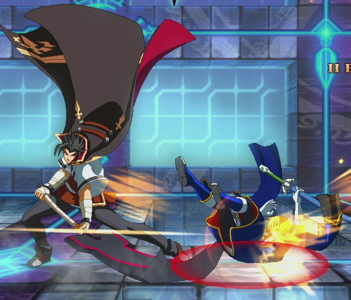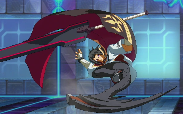 Kagura lifts his sword up with both hands and swings it in a multi-hitting arc while rising off the ground. Anti-air special. Has a fair amount of untech time, and a difficult move to punish on air hit. Has some invincibility. Can scale well in combos as you can combo off a counter hit after landing. Starter Rating worsened from Fast to Very Fast in Patch 1.1, and launches opponent lower on hit with a wall-stick on counter-hit. CP 2.0/EX: Now has a B version added with the C version. B version leaps up a small amount with only head invulnerability (but is air unblockable) while the C version files up fairly high with full invincibility (but can be blocked in any way).