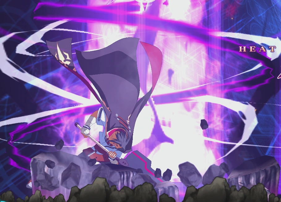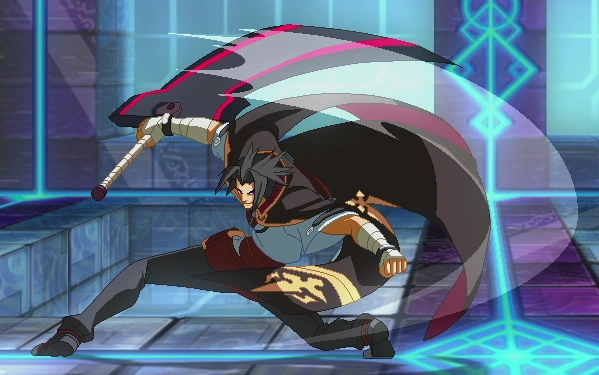 Kagura attacks the opponent with two crossing-slashes (the same animation used for his Overdrive version of Gokuenjin) as black and purple lightning courses around his sword. He points his sword toward the sky and a cinematic occurs where his sword emits a large pillar of black energy. There is a zoomed in shot on Kagura’s face which pans out as he delivers the final blow by crashing his sword down on the downed opponent.
