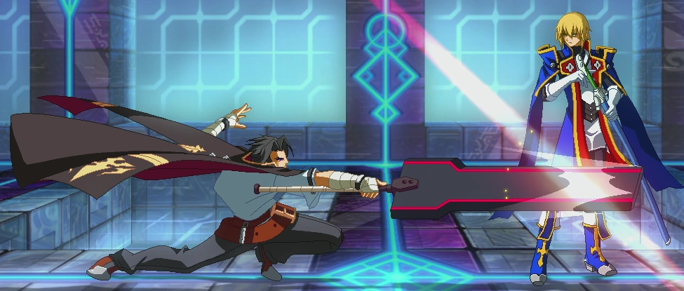 Does a turning two-handed slash from the background that sweeps around him in one step. Long range and can control quite a bit of space, but is a bit slow to chain into from other normals. Counter Hit causes wallbounce. Blowback on air hit. As of 1.1, it has less recovery, hitstun, damage (from 1100 to 1000), blockstun, blowback on air hit and untech time. It no longer staggers the opponent on grounded hit.