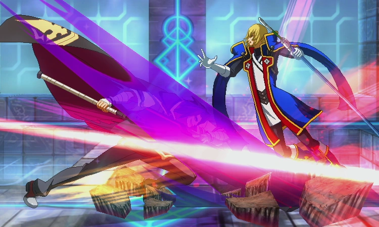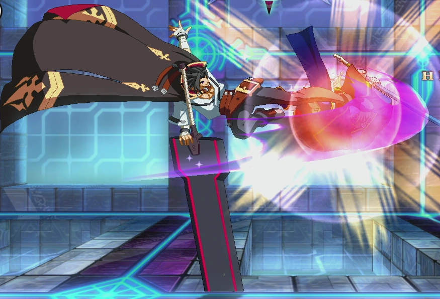 Kagura charges his blade with dark energy as he brings it over his shoulder, then slams it down on the ground to cause a purple flame pillar to launch his opponent. Can legitimately be done in midair where unlike all his other stance attacks, Kagura activates the super flash while in midair and lands on the ground with the attack. The initial slash must connect to make the energy pillar appear.