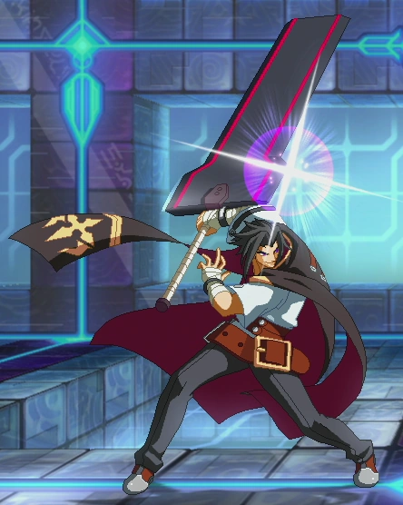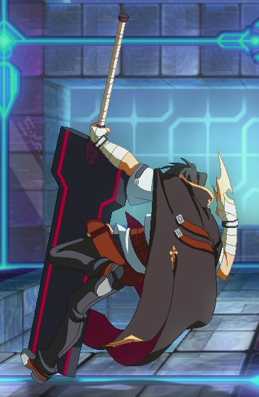 Turns to the background as he leans (with his sword planted down and supporting him) and smashes his following elbow downward in a recovering turn. Hits overhead. Will force crouch the opponent. Cancellable mainly into a special, Rapid Cancel or Overdrive. Has less recovery as of 1.1, but less frame advantage on block and can no longer cancel into a 6B or specials. Causes ground bounce on air hit in CP 2.0/EX. Now has bonus proration in Centralfiction.