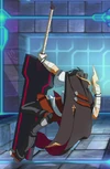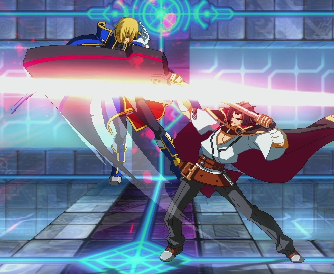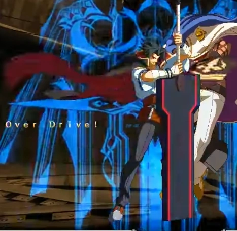 His Overdrive is Vehemence Edge (ヴィエメンスエッジ,Viemensu Ejji, localized as Infinite Coupling), which grants him the ability to infinitely perform multiple Drive stance transitions/cancels for the duration, as well as granting new hit effects on some of his stance-based moves (some of his normals also gain new properties as well).