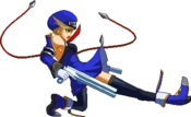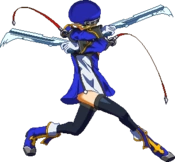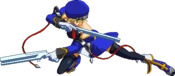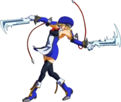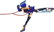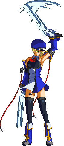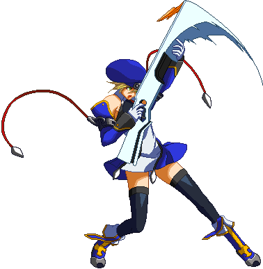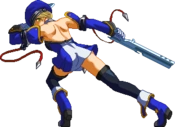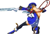 Noel Vermillion’s Drive is Chain Revolver (チェーンリボルバー,Chēn Riborubā), and can be extremely spammable and may even seem cheap at low levels of play, it is in fact fairly unsafe and demands that any player seeking to use Noel competitively becomes familiar with her move properties. Although Noel is fairly fast and has good range, she has nothing that actually combos out of most of her pokes on a standing opponent, and most of the moves that do combo are either fairly situational or have slow startup. When she does land a solid hit, however, Noel is capable of extremely high-damage combos.