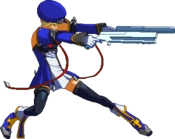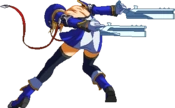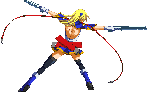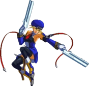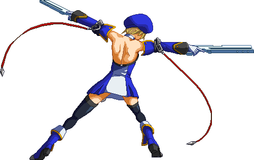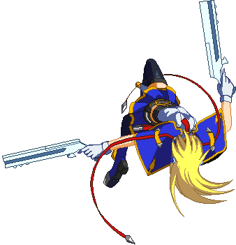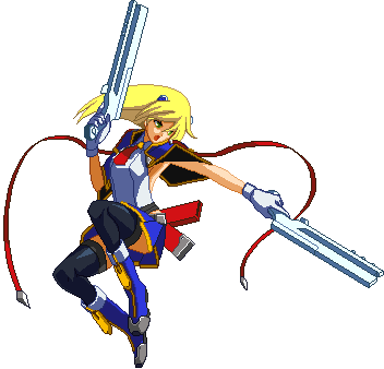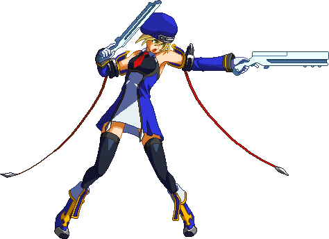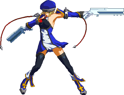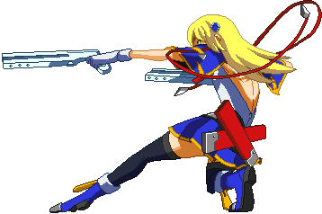 Fires guns in both directions. Resembles BlazBlue: Calamity Trigger 5C. Basic combo filler. Projectile property.