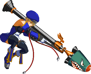 Noel fires a volley of bullets, followed by a missile. Extremely fast startup. Bullets stun the opponent in midair for a very long time if they hit. Missile breaks 2 primers. No longer can move or guard after the missile until landing