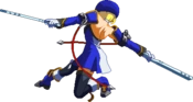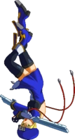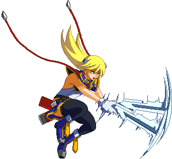 Spins forward very quickly, then tackles with shoulder. Crosses over opponent. Breaks one guard primer. Unsafe on block. In BlazBlue: Continuum Shift Extend, it causes slide towards corner on normal hit and wall bounce in the corner or on counter hit allowing follow-ups midscreen.