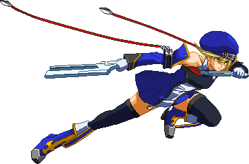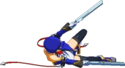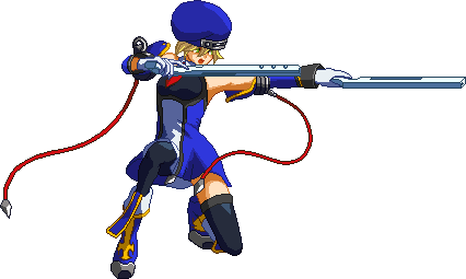 Swings gun in a diagonal arc. Vertical hitbox shrunk compared to BlazBlue: Calamity Trigger, now has trouble hitting opponents below Noel.