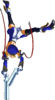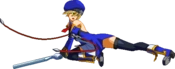 Flips forward and catches the opponent with her legs. Only hits standing opponents (whiffs on crouching or airborne opponents). Unblockable. Resembles a throw, but cannot be teched even when comboed into.