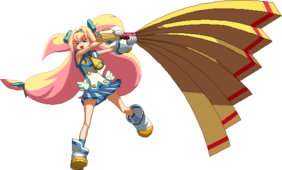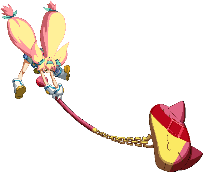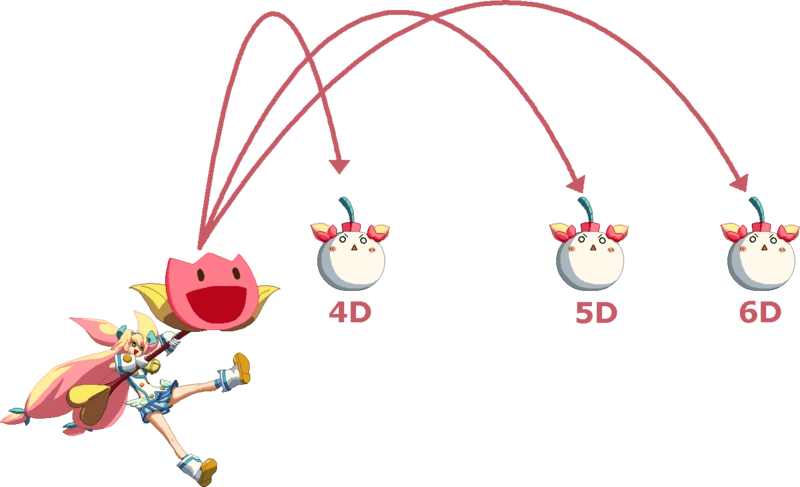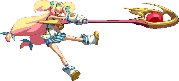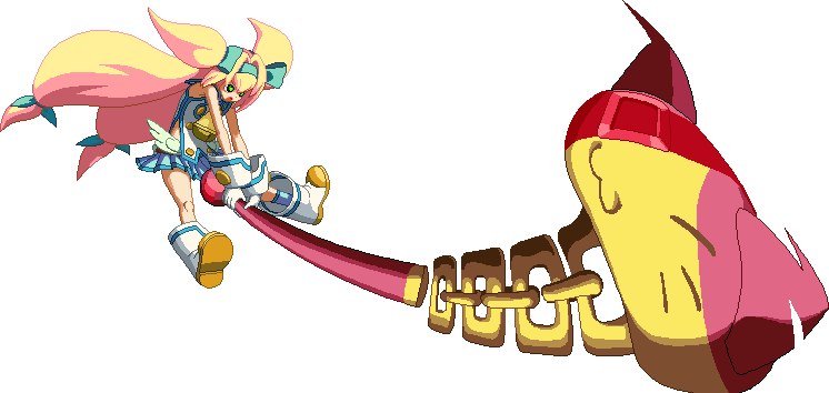 Turns her staff into a popgun and shoots a big glove out. Extremely deceptive hitbox, hits much further than it looks. Very useful in corner carry combos (can be combo’d any time after close 2C), or after 5D Pan/Fan, j.D bat, or a very high hitting Mami Circular also combo in the corner.