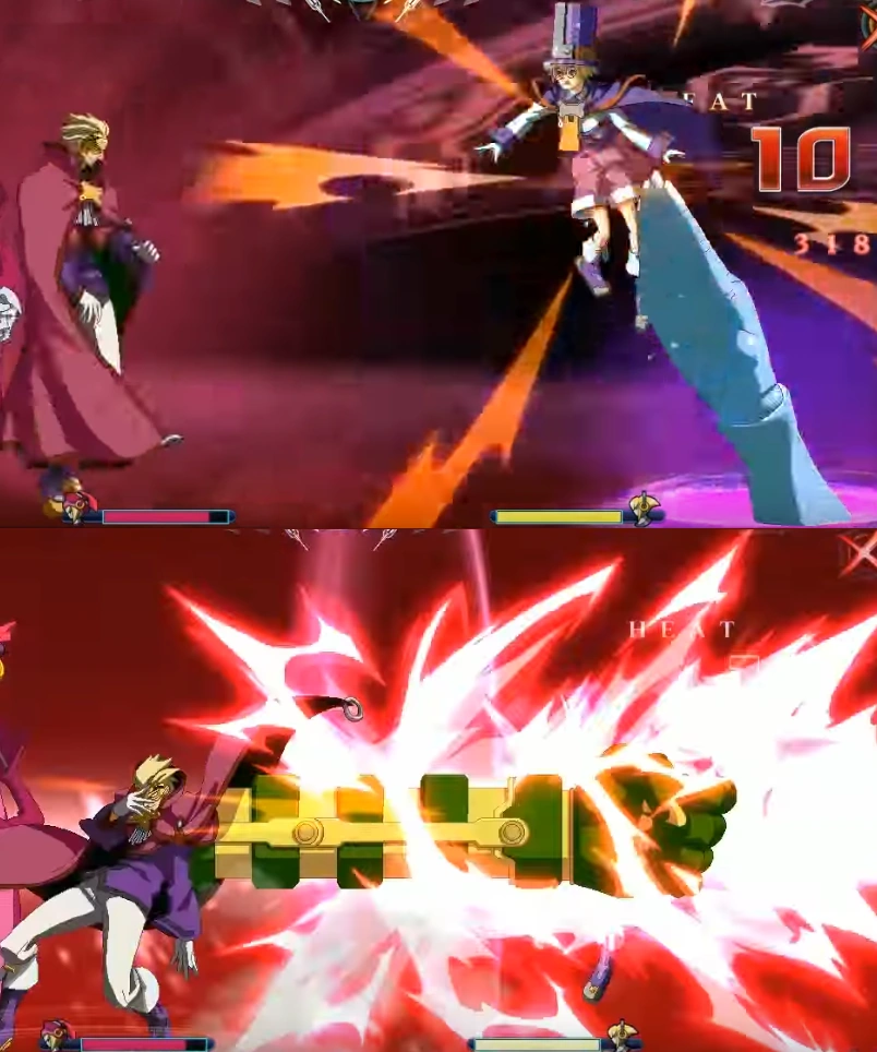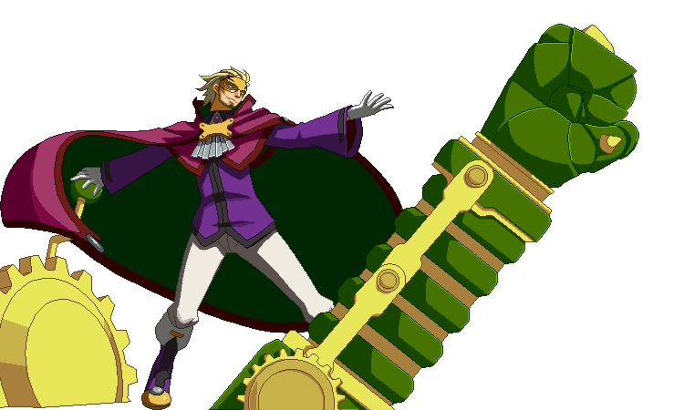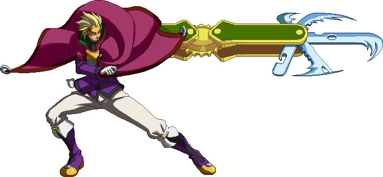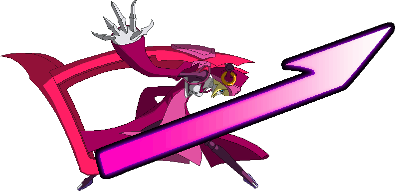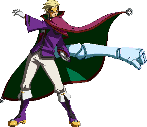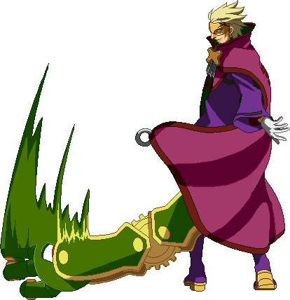 Two green mecha-like hands come out of Relius’ mantle, punching the opponent in a pliers-like fashion. It has short reach making it difficult to use as a poke but it is pretty powerful. It is jump-cancelable and on CH it causes staggering on the opponent. Two-hit move.