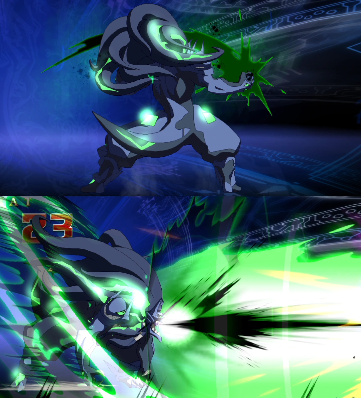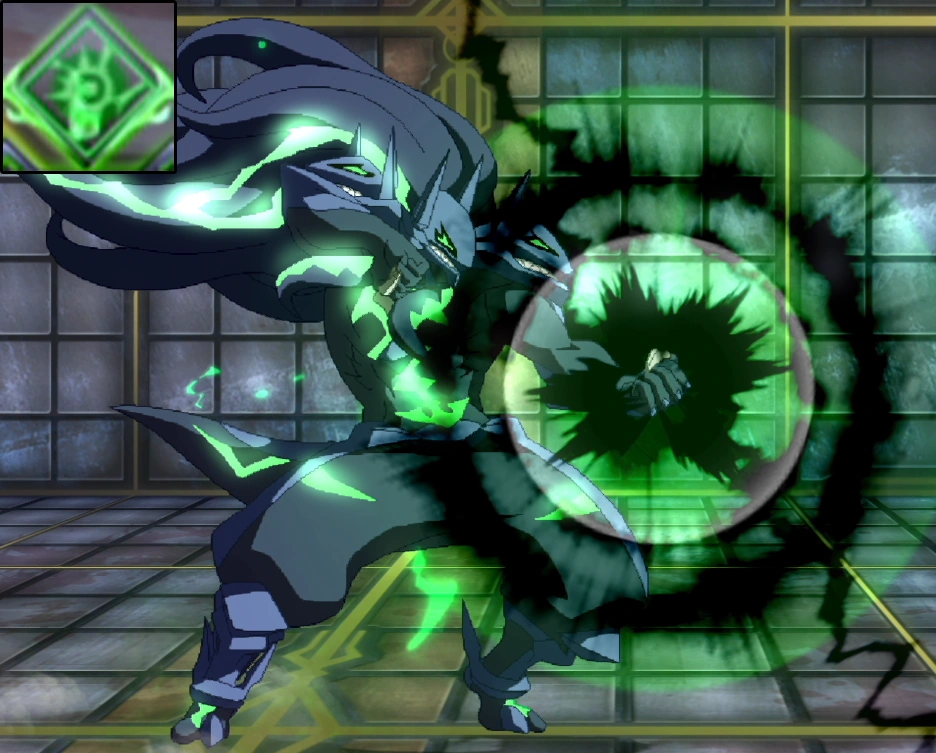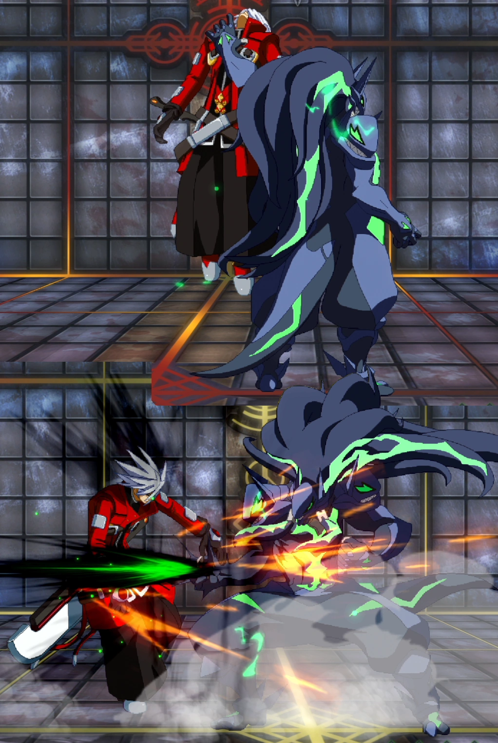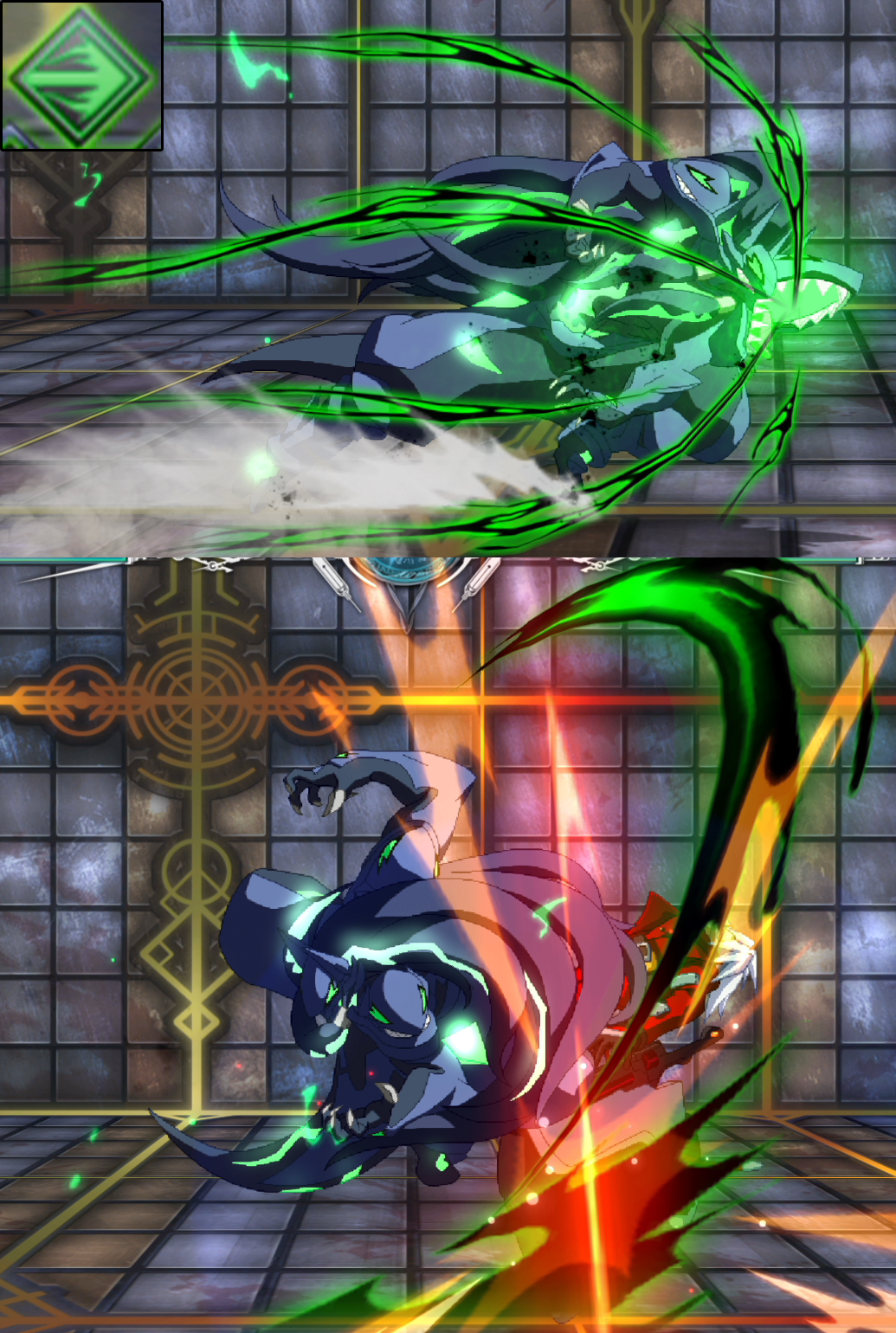 Obviously, as a rushdown character, Susanoo lacks defensive tools. His Counter Assault uses the animation of 5D and has therefore pretty good range. Miraculous Emitting: Towering Flame (灼キ噴ク・楼焔 Yakifuku: Rōen, localized as Towering Flame) is a nice defense option, but is terribly unsafe if blocked or whiffed and should be used thoughtfully. Lastly, Releasing: Dagger of Demon Burial (解キ放ツ・魔葬ノ凶刃 Tokihanatsu: Masō no Kyōjin, localized as Liberating Dagger) can be used as a reversal option since Susanoo is fully invincible during the move, but it’s even worse on block than Towering Flame.