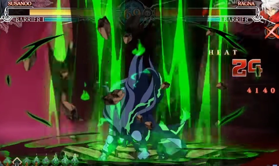 The key to success when playing Susanoo is to unlock mentioned special attacks. He has eight icons above his Heat Gauge, which are all locked with the exception of the first seal. Each of these seals represents a special attack. Normal hits on your opponent, even if the attack was blocked, will cause a cursor to appear and mark a special. The cursor cycles through the eight seals in numerical order and will reappear at the first seal if the cursor was at seal 8 when another hit was dealt. All of his Drive attacks will unlock the marked seal or level it up if possible, and set the cursor back to 0. Susanoo’s unlocked specials do not carry over round, they have to be unlocked again every round.
