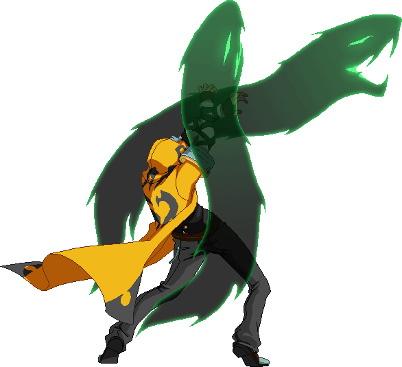 Turns in midair and strikes downward with a clawing motion of darkness downward with his leading hand. Similar looking to Hazama’s Falling Fang (214D->A) animation and staple of Terumi’s pressure. Can be used for cross-ups, overhead, and to extend pressure since it is positive on block. Can be TK’d very close to the ground as an overhead. On hit, a low j.2D can be comboed into 5A on a standing opponent and 5B on a crouching one.
