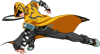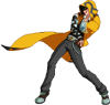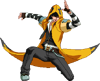 A forward hand-standing knee strike. Gives lower body invulnerability while also shrinking his hurtbox vs. high attacks. Can be chained from most normals and is a great pressure tool, as it it advantageous on block. However, at a cost, it lacks any mid-level invincibility and/or projectile invincibility of any sort (which in turn makes Terumi very vulnerable to most reversals). Can also Fatal Counter. Can be held down to feint the attack, but doing so will give it no invincibility frames whatsoever, thus it must be used with caution during pressure in some matchups.