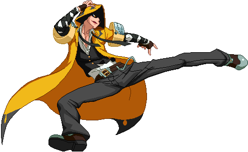 Kicks forward with his leading leg while holding his hoodie and brings it in for an inward spin kick. Similar to Hazama’s j.B, but deals two hits. Later frames will hit behind Terumi, which can cross-up like Hazama’s j.B.